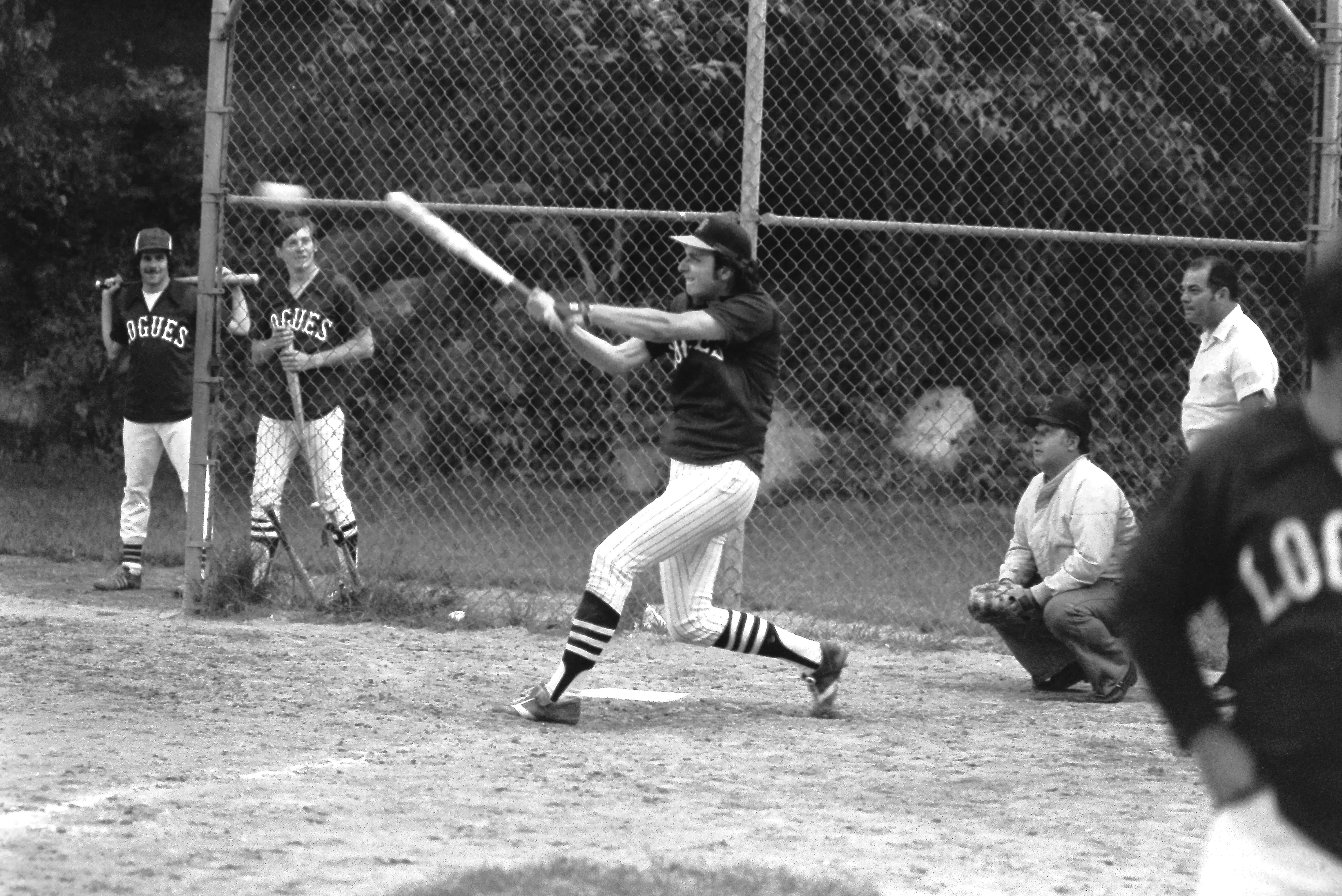 Chip Bingham batting for Logue’s in an adult softball game. Probably in the late 1970’s. Bob Bernaducci and Butch Chemka in the background. Bob Usher umping. Could be Chubby Nyemchek catching.