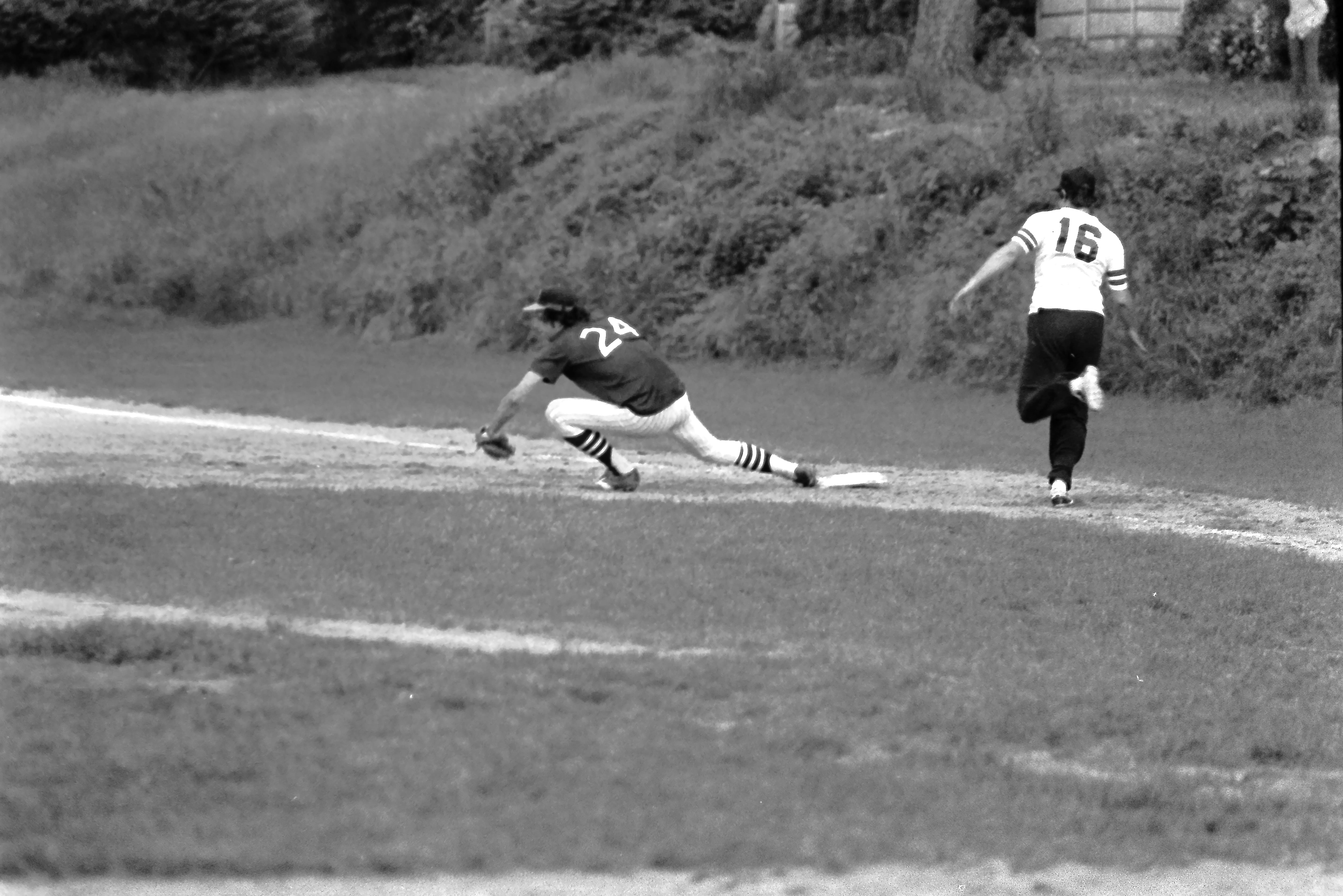Chip Bingham with a nice defensive play at first base. Circa 1979.