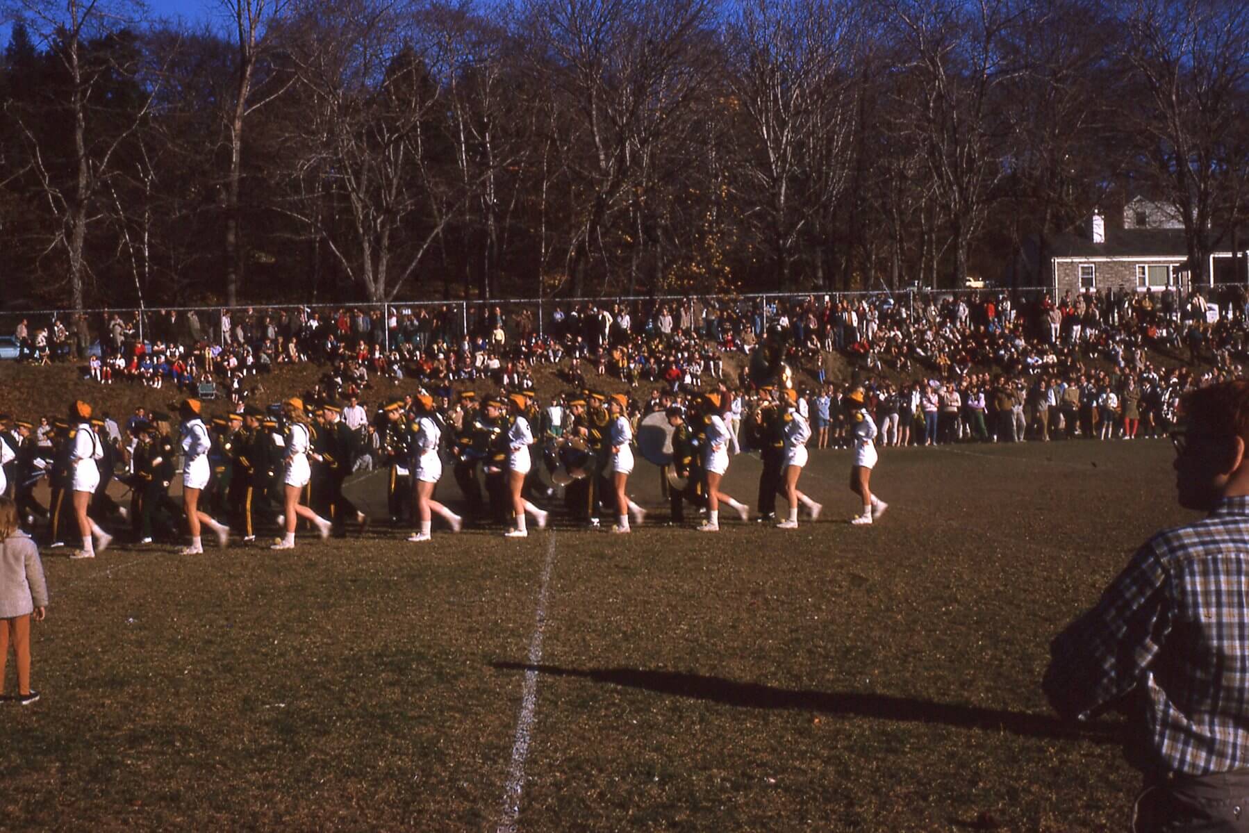 This is an HHS Varsity Football game in 1964. Hastings at Dobbs Ferry at Gould Park. The Hudsonettes and the HHS Marching Band are on the field at halftime.