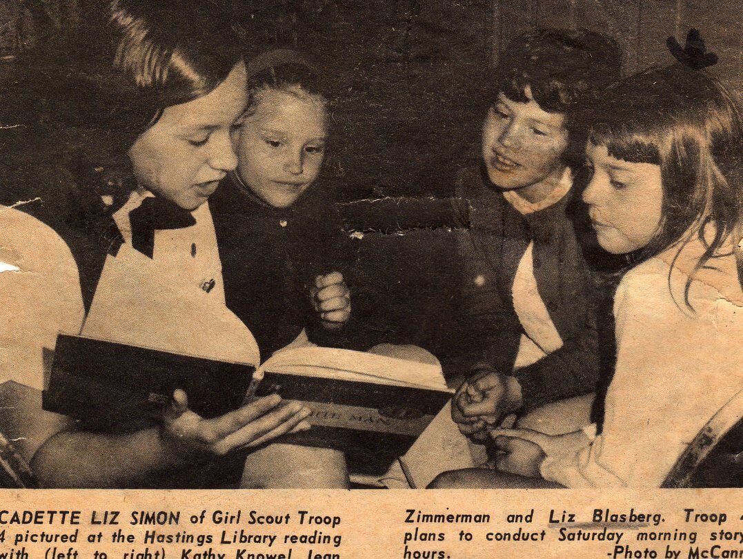 Liz Simon reading to Kathy Noll, Jean Zimmerman, and Julie Blasberg when Kathy, Jean, and Julie were Girl Scouts in 1966.
