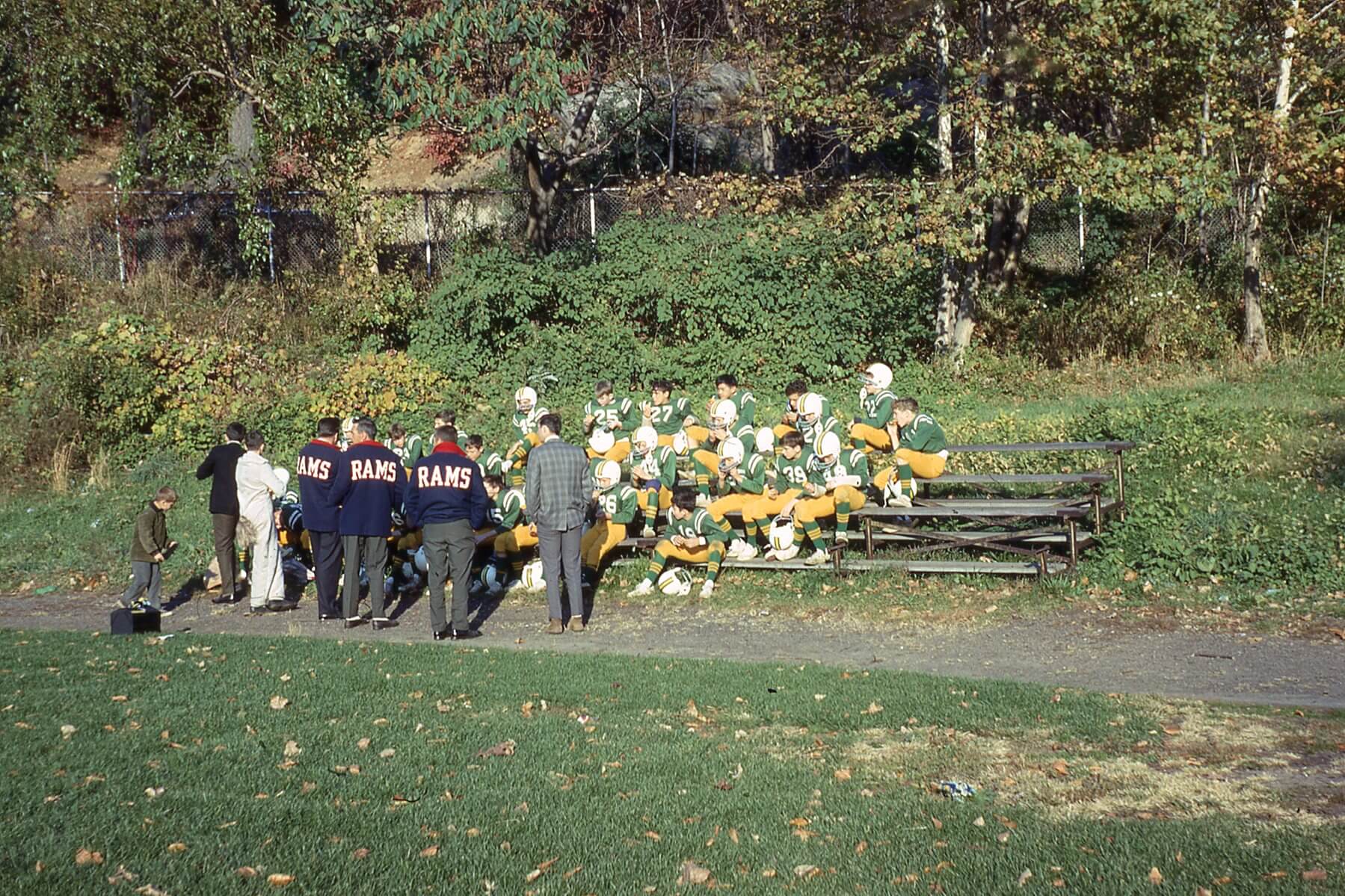 Hastings Rams having a team meeting at halftime of a Rams football game at Reynolds Field in 1967.