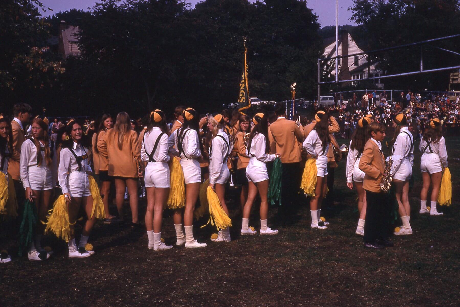 The HHS Marching Band and The Hudsonettes are about to take the field to perform at halftime during an HHS Varsity Football Game at Reynolds Field in 1971. Identifiable people are Lee Marquard, Debbie Kling, Jeff Edelman.