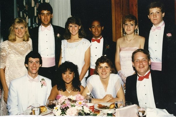Rachel Hutson, Jon Eshoo, Larry Lindner, Mark Zimmerman, Michael Bennett. This is a group of Hastings High School students at the prom in 1986.