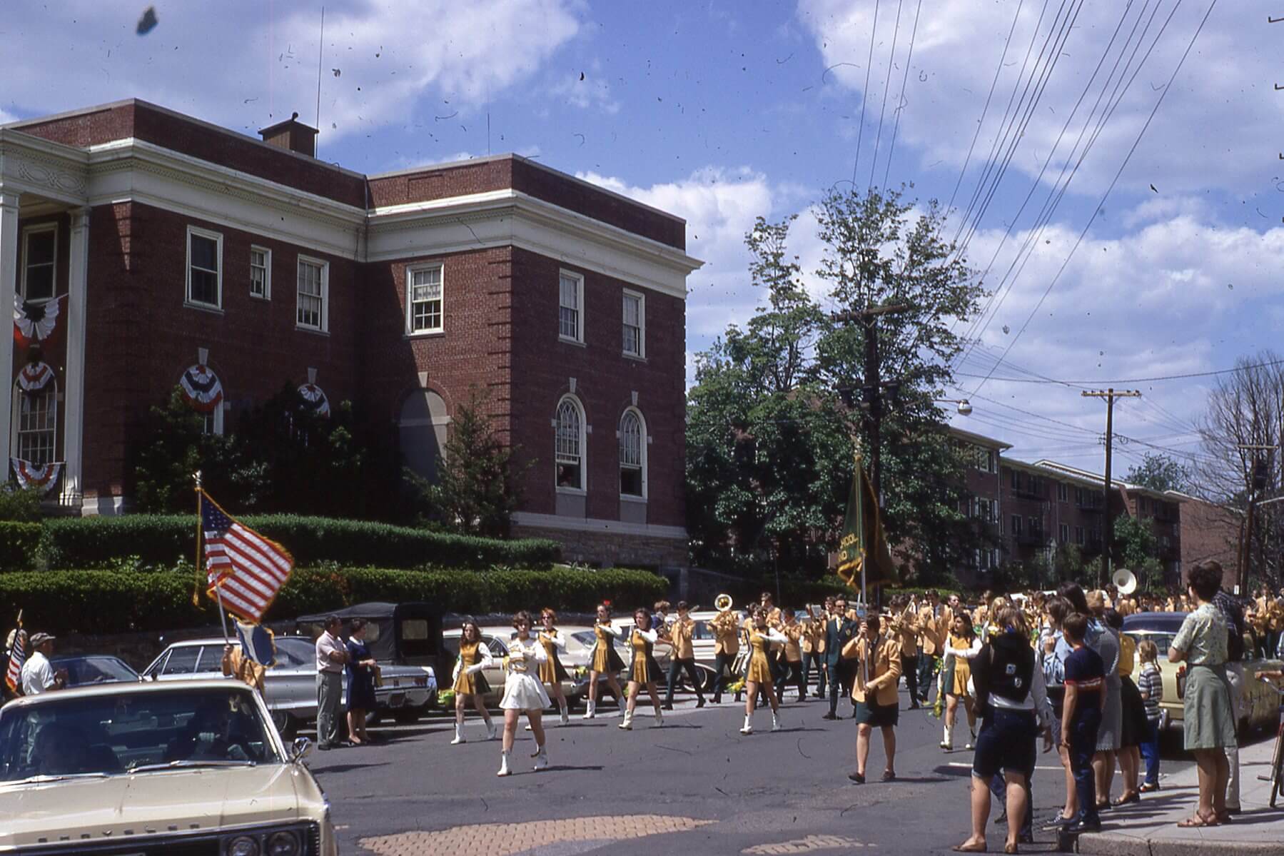 The HHS Marching Band about to make the turn up to Spring Street during the 1967 Memorial Day Parade.