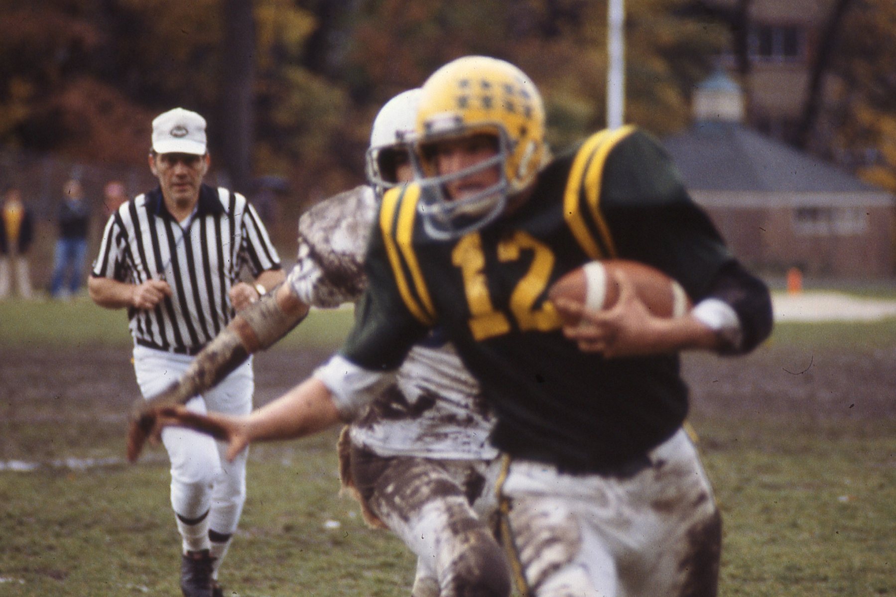 Taylor Montgomery/Gordon Solovey Football Collection. 1978-1981. Picture 106 of 296. Quarterback, Tom Fleming, carrying the ball in a muddy game at Reynolds Field in 1979.