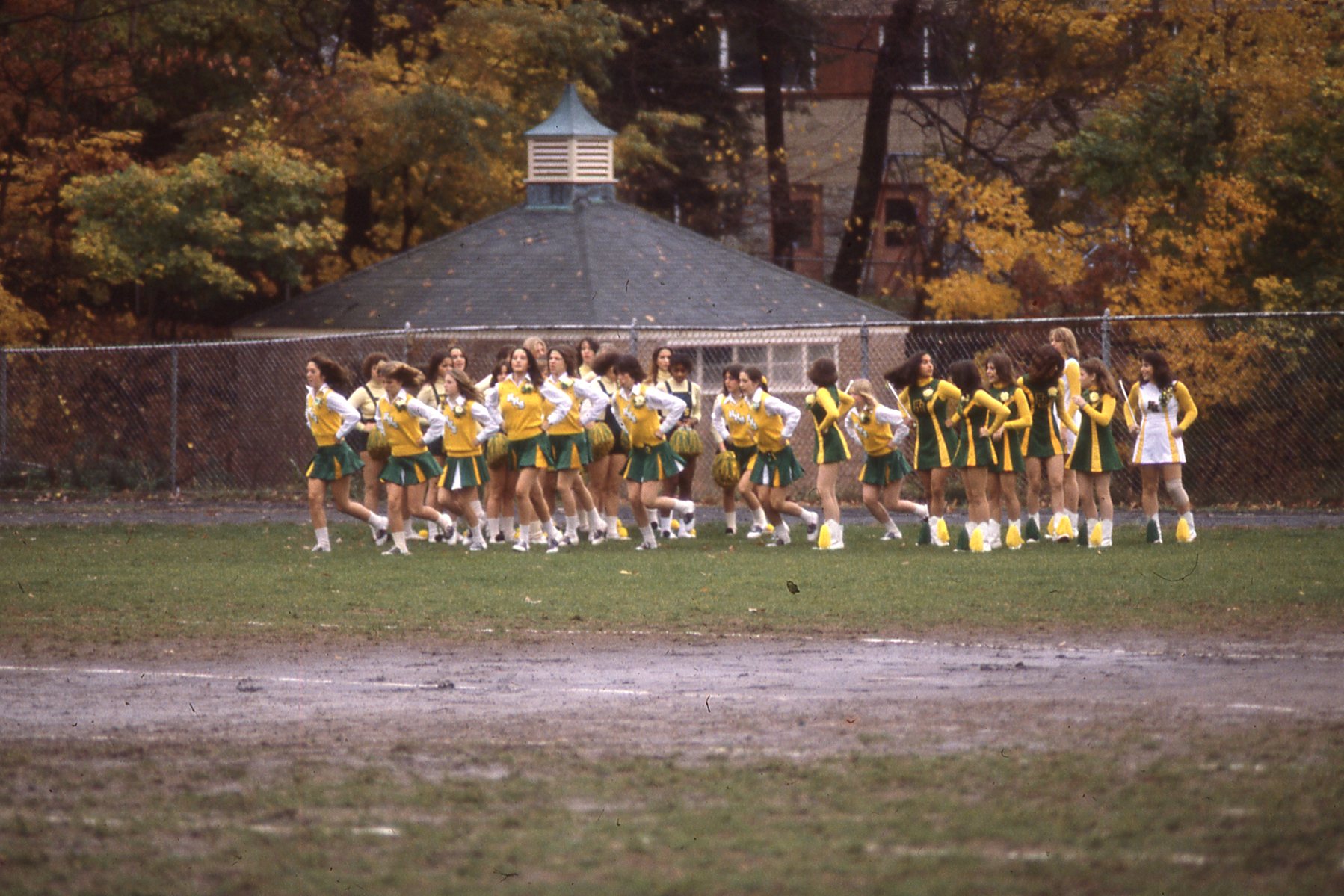 Taylor Montgomery/Gordon Solovey Football Collection. 1978-1981. Picture 110 of 296. Hudsonettes, Cheerleaders, and Twirlers together taking the field. Most likely in 1979.