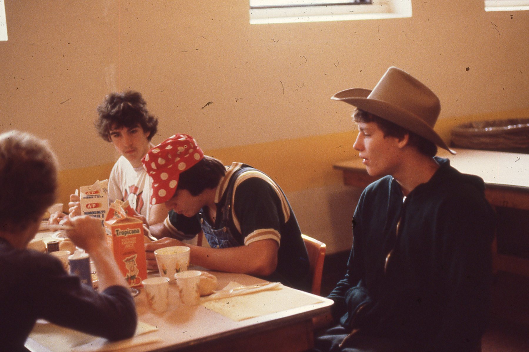 Taylor Montgomery/Gordon Solovey Football Collection. 1978-1981. Picture 153 of 296. Paul Foley, Rocco Capuano, Dominick Cristello at the pre-game meal. 1980.