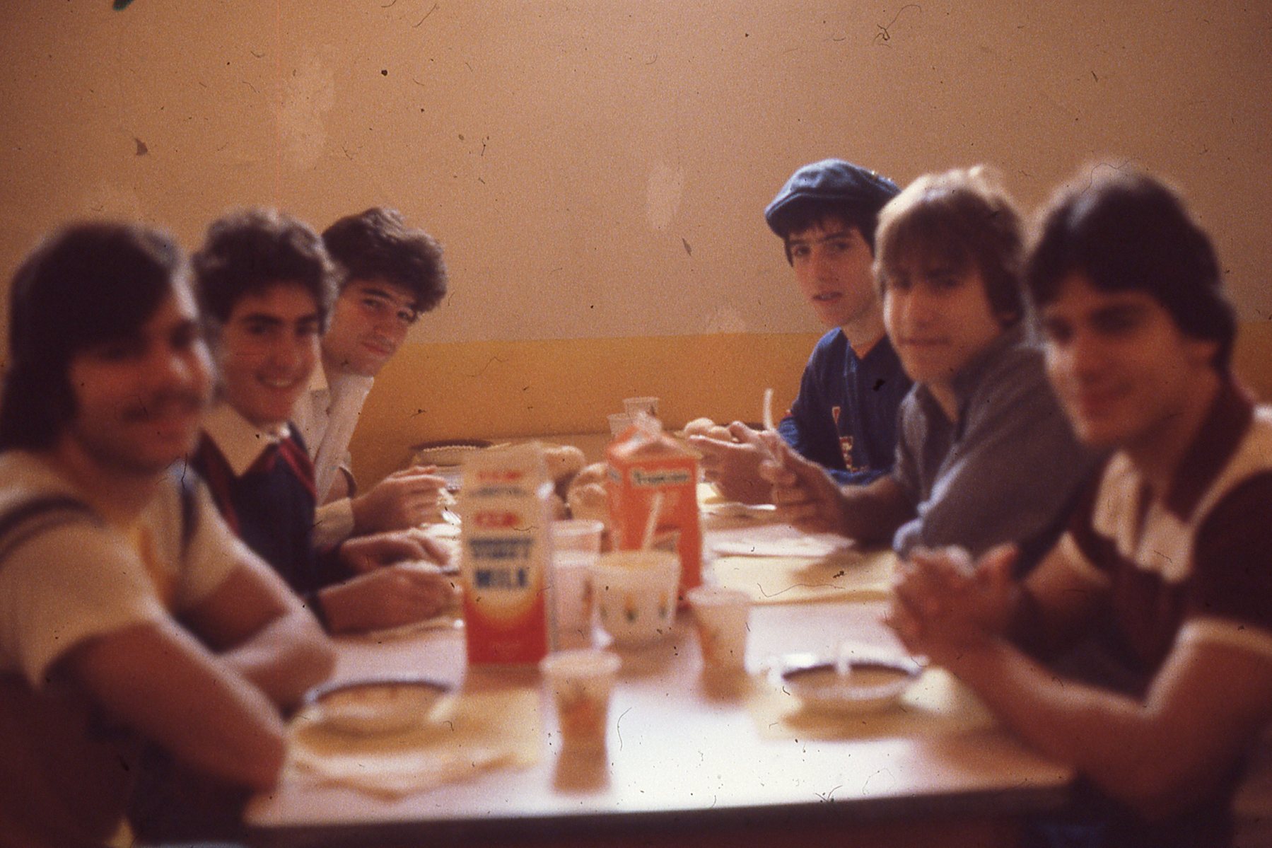 Taylor Montgomery/Gordon Solovey Football Collection. 1978-1981. Picture 154 of 296. Mike Mechanic, Jonathan Rosenberg, Taylor Montgomery, Mike Mancuso, David Duke, James Grant. Pre-game meal, 1980.