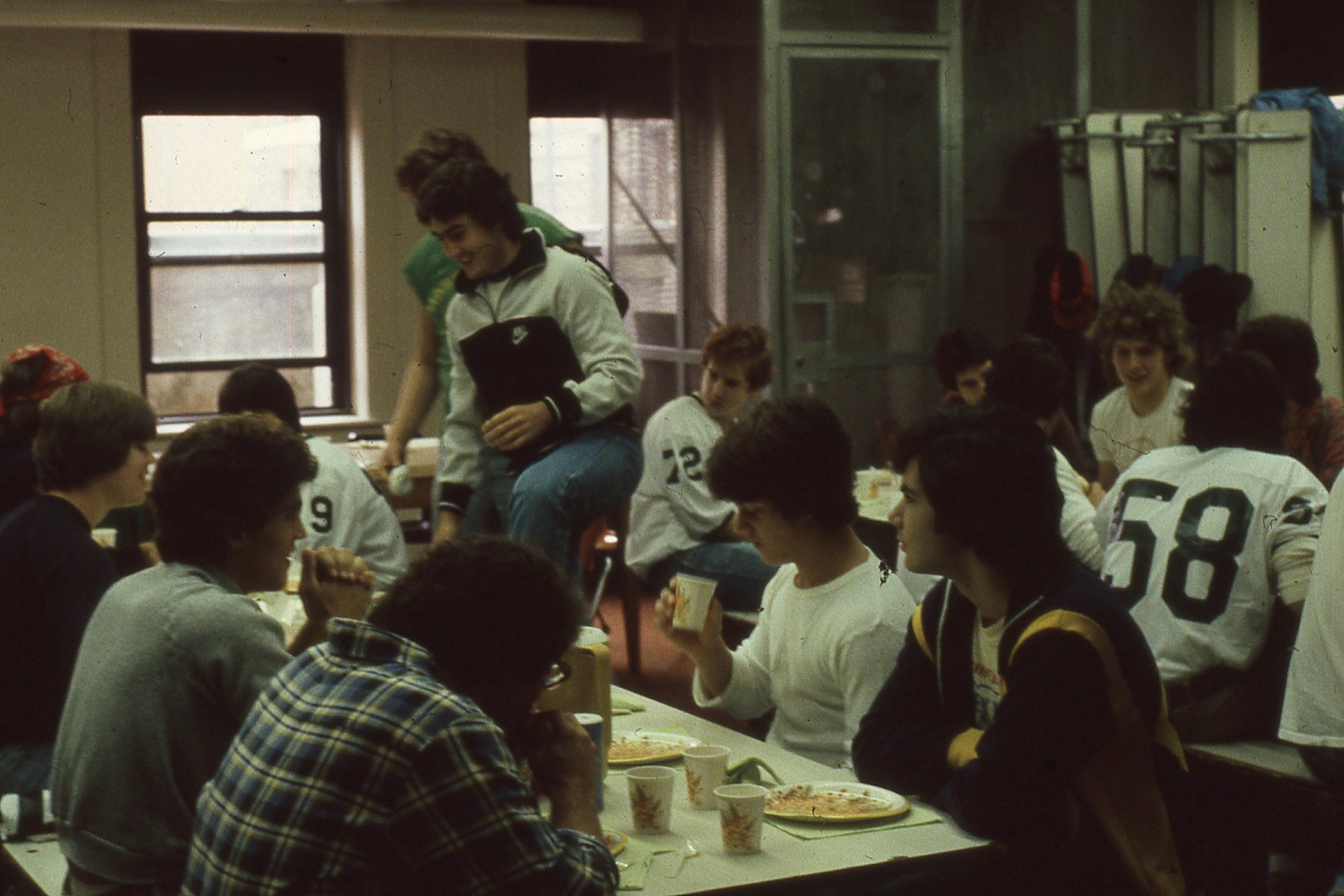 Taylor Montgomery/Gordon Solovey Football Collection. 1978-1981. Picture 168 of 296. Hanging out at the pre-game meal. 1981. Coach Frutkin on left. Bobby Kennedy and Mike Mulcare to his left. On other side are Mark Mechanic, Kevin Kennedy, and Jonathan Rosenberg. At next table, number 72 is Steve Sack with James Grant across from him. Dave Robinson next to James. 58 is Randy Belkin.