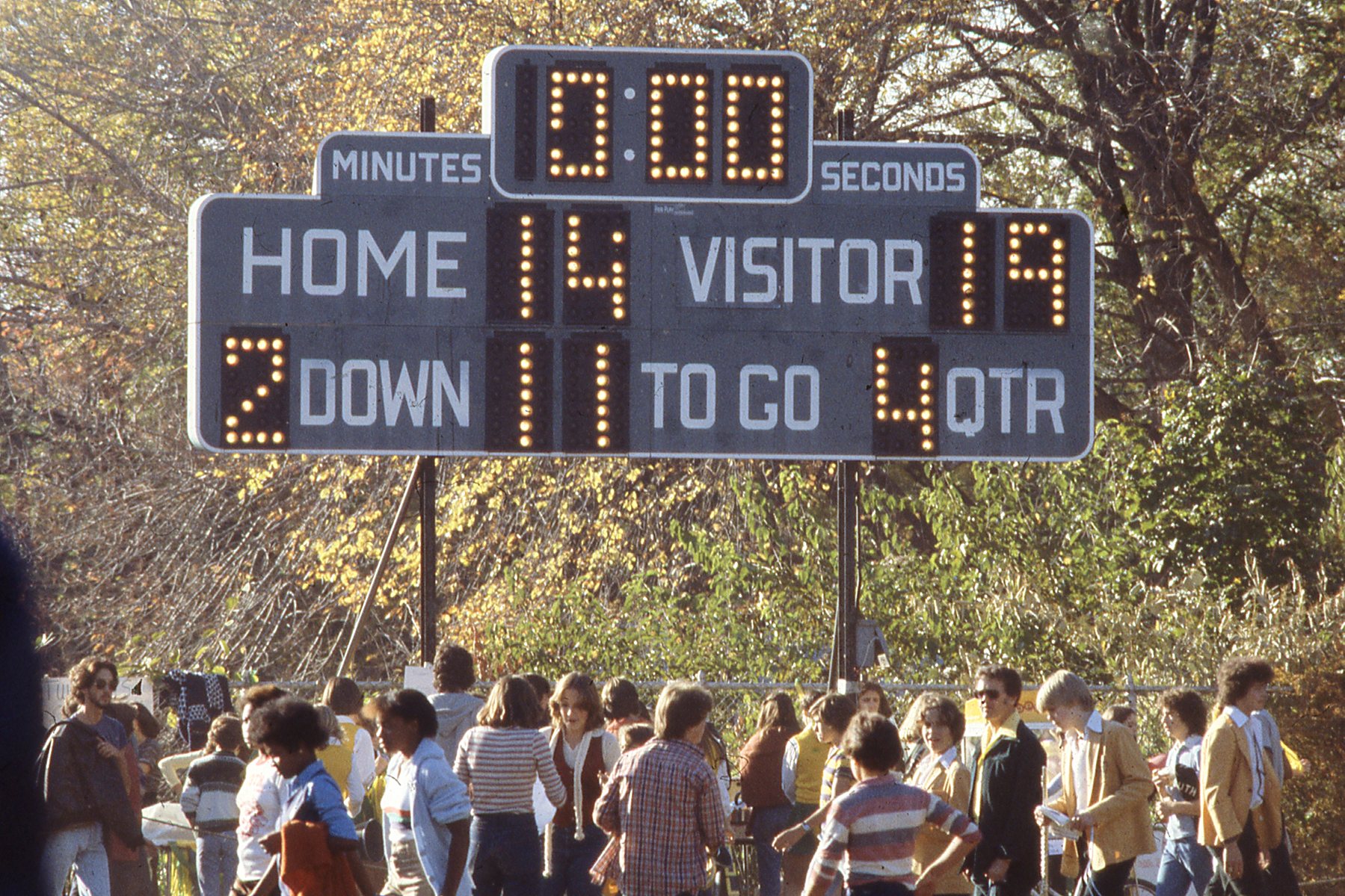 Taylor Montgomery/Gordon Solovey Football Collection. 1978-1981. Picture 18 of 296. Scoreboard shows a Hastings loss by the score of 19-14. 1978. Band Director, Pete DeLuke in sunglasses towards the right.