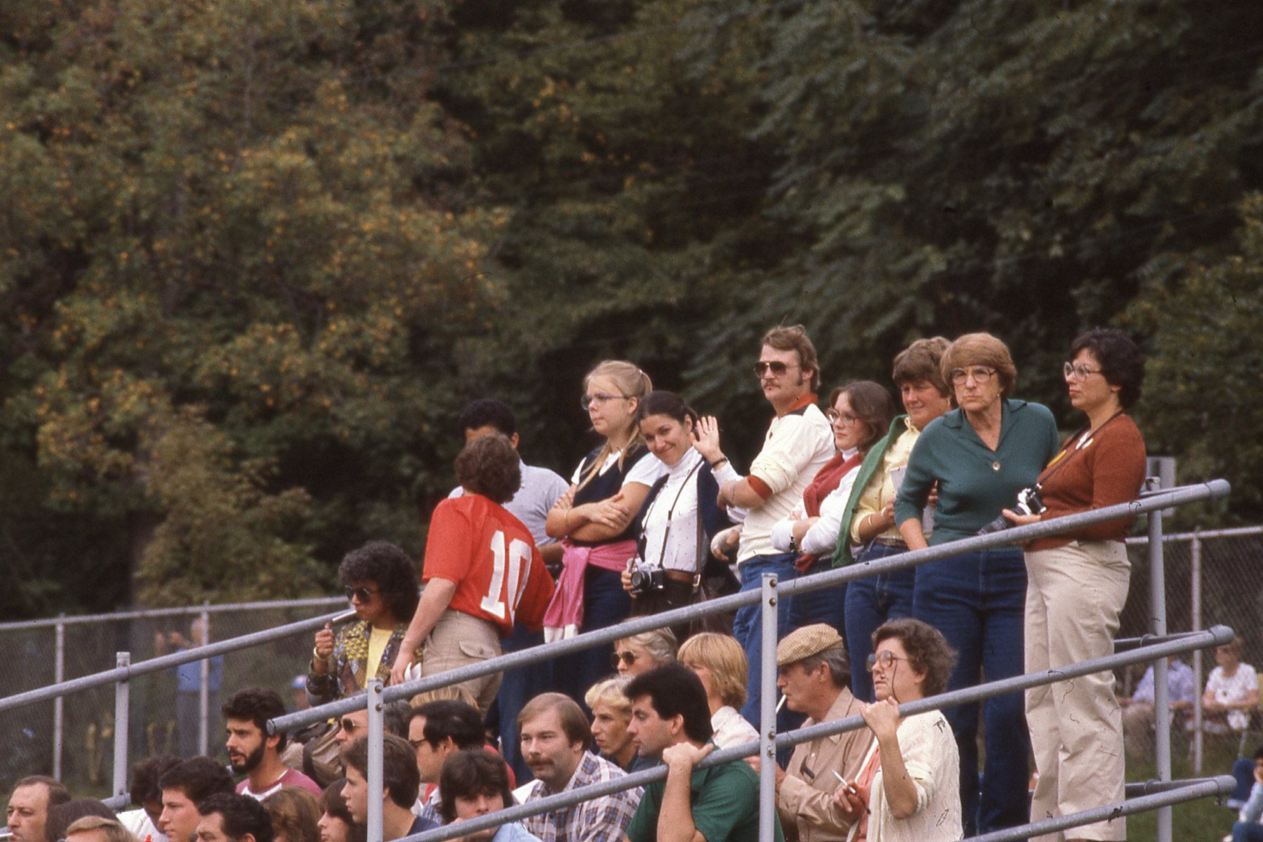Taylor Montgomery/Gordon Solovey Football Collection. 1978-1981. Picture 181 of 296. Fans at the Hastings at Dobbs Ferry Football game in 1981. Identifiable in the stands are Ibby Rutherford and Rosemary Eaton, two of the gym teachers at HHS. Probably Mrs. Grant to Rosemary Eaton’s left. And Greg Kalmes, John DeFilippo, Greg Kiernan, Pete Ryan, Mr. and Mrs. Ryan, and Mrs. Flood.