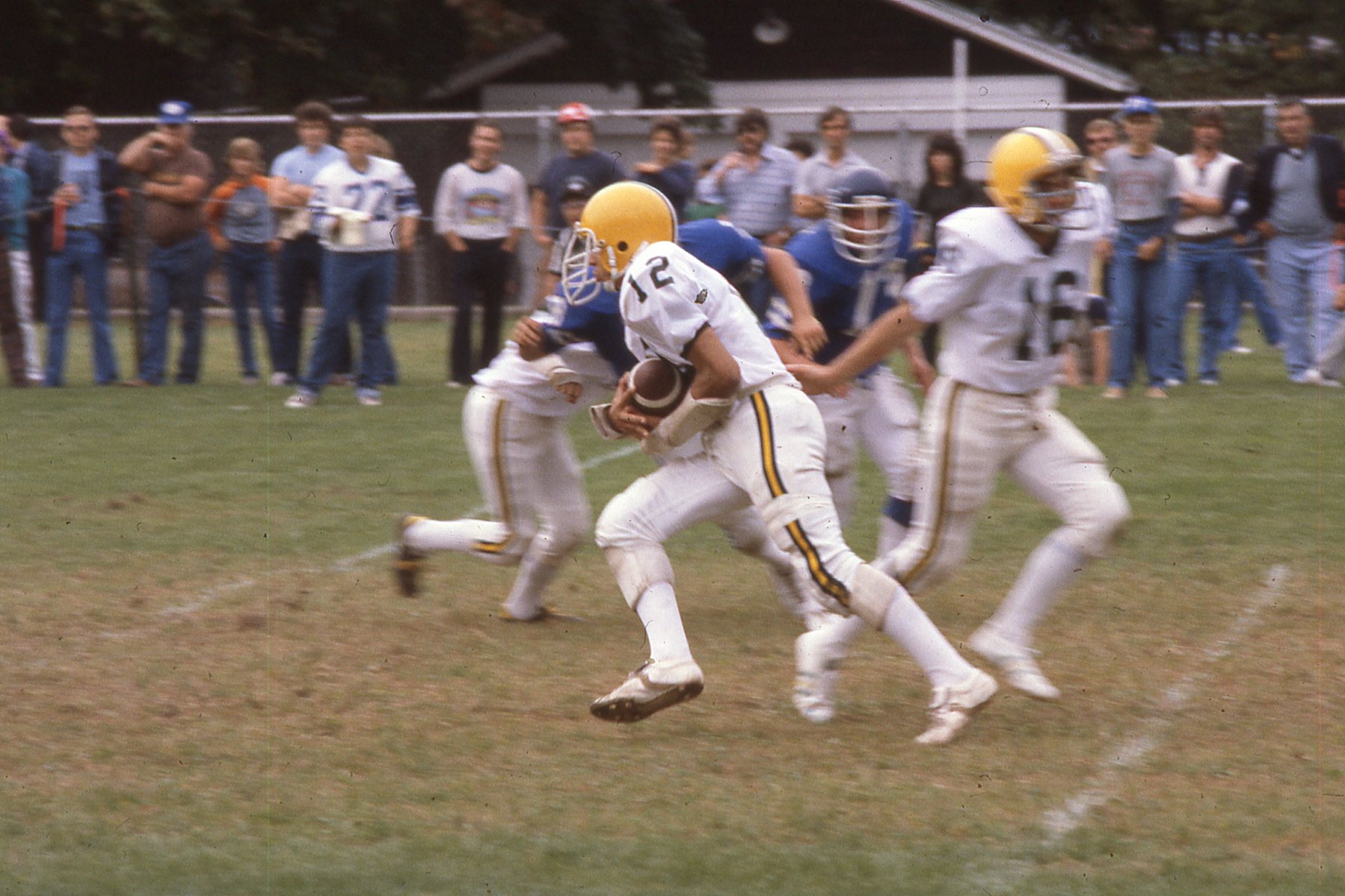 Taylor Montgomery/Gordon Solovey Football Collection. 1978-1981. Picture 187 of 296. Quarterback, Gordie Solovey, handing the ball off to Jason McGuiness at the Hastings – Dobbs game at Dobbs Ferry in 1981.