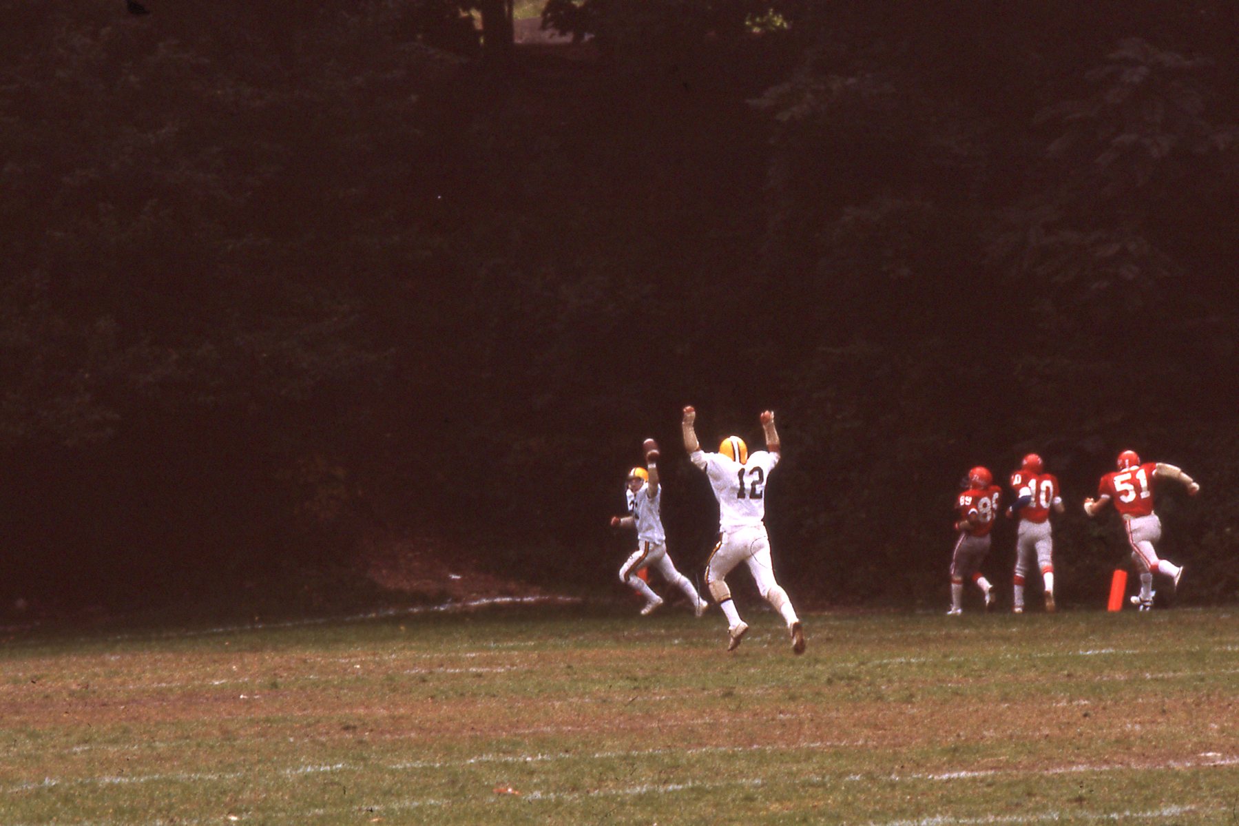 Taylor Montgomery/Gordon Solovey Football Collection. 1978-1981. Picture 203 of 296. Jason McGuiness is number 12, celebrating a Hastings touchdown. 1981.