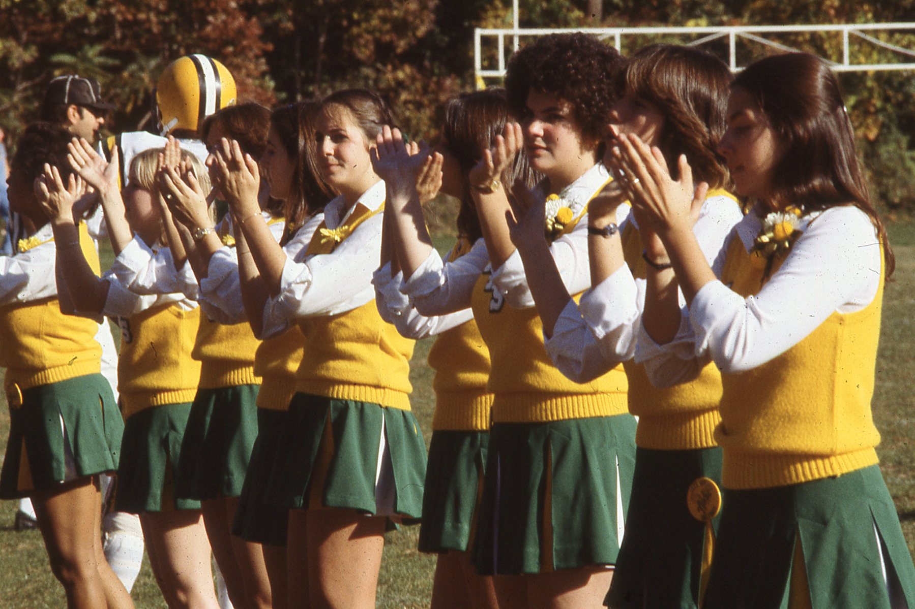 Taylor Montgomery/Gordon Solovey Football Collection. 1978-1981. Picture 21 of 296. Cheerleaders on the sidelines. Carol Klipp, Jenifer Leaf, Linda Whitehead, Kerry Schmidt, Bev Waczek, are visible. This photo was in the Fall of 1978.