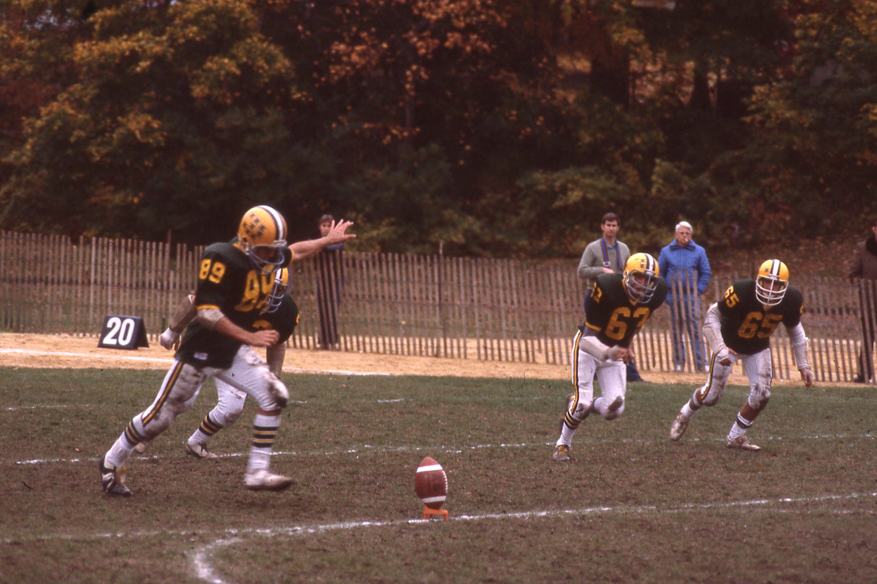 Taylor Montgomery/Gordon Solovey Football Collection. 1978-1981. Picture 238 of 296. Kickoff by Hastings. 1981. That is James Grant kicking off. 63 is Tommy Robbins. 65 is Jonathan Rosenberg.