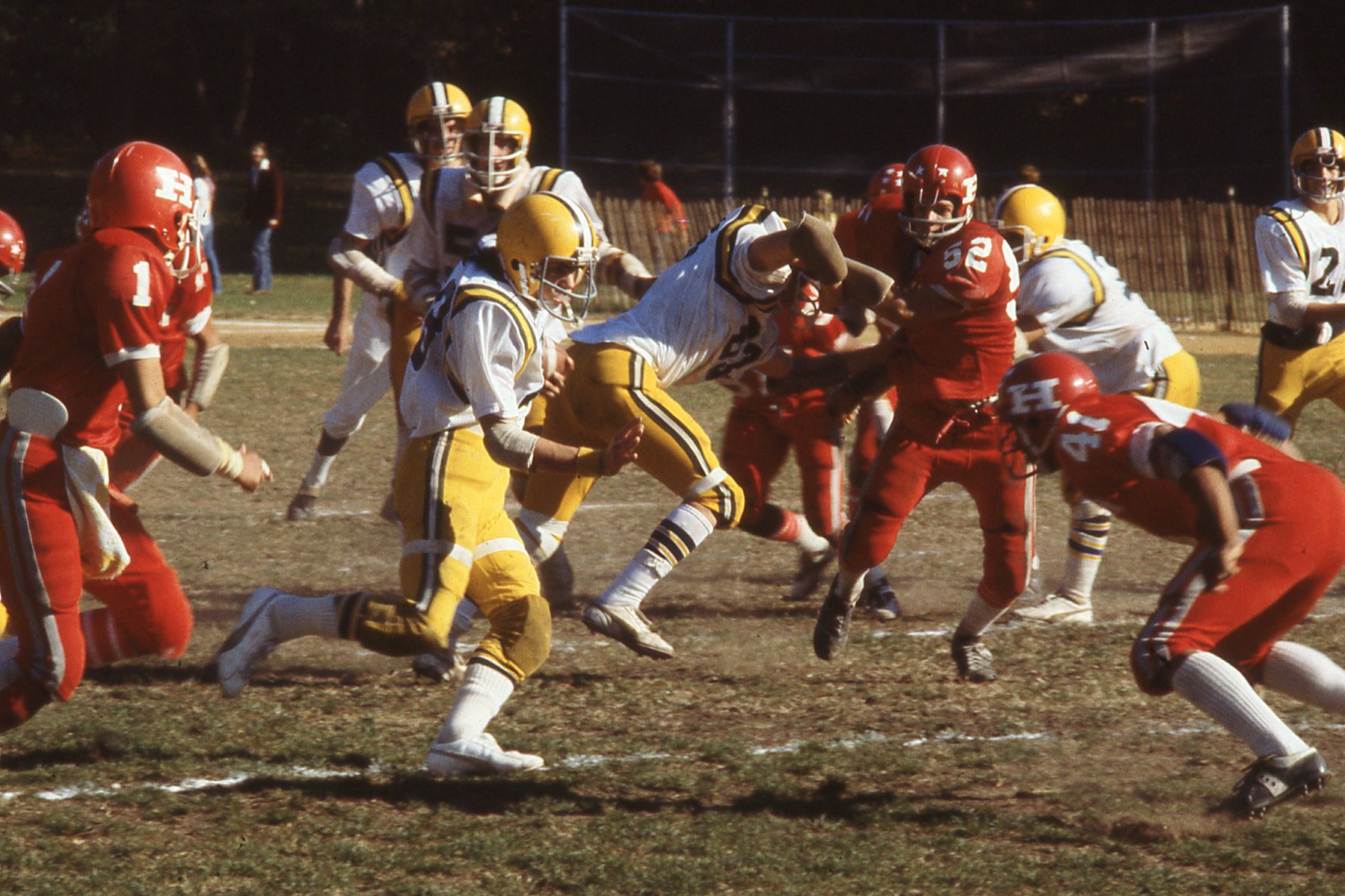 Taylor Montgomery/Gordon Solovey Football Collection. 1978-1981. Picture 25 of 296. Hastings on offense running the ball in a game in 1978 versus Alexander Hamilton at Reynolds Field.