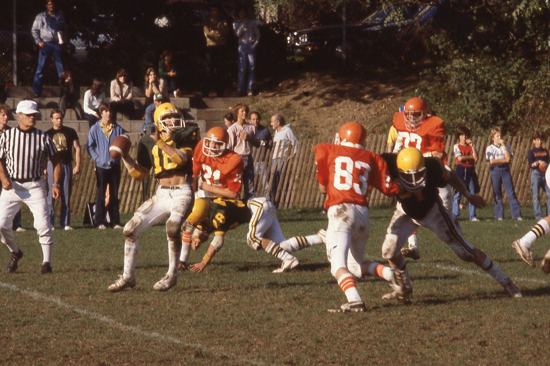 Taylor Montgomery/Gordon Solovey Football Collection. 1978-1981. Picture 34 of 296. Hastings legend, Mike Kozel, watching game on sidelines. And oh yeah, quarterback Joe Capuano back to pass. Fall 1978. Paul Berger also along the fence.