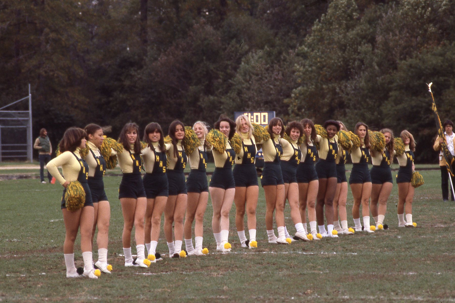 Taylor Montgomery/Gordon Solovey Football Collection. 1978-1981. Picture 42 of 296. Hudsonettes 1978. Alice Mitrione, Carla Jones, Mary Ann Danahy, Robin Aluisio, Nancy Bennett, Pam Localio, Cathy McGee, Lori Ohberg, Kerry Schmidt, Suzanne Bauer, Jorie Trafford, Maureen Edwards, Melissa Joyce, Bronwyn Eaton, Cathy Cugliari. Mario Spagnuolo is in the background holding the flag.