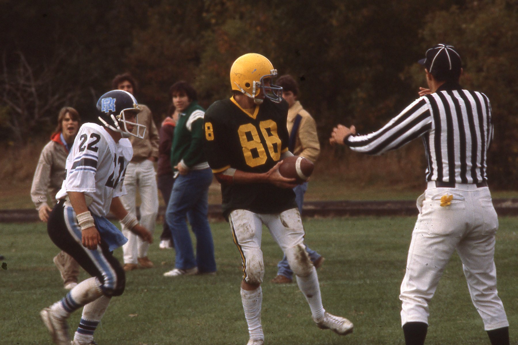 Taylor Montgomery/Gordon Solovey Football Collection. 1978-1981. Picture 57 of 296. Bryan Gonder with the ball versus Rye Neck. Michael Haje in the back left. Looks like may be Greg Bassman in green jacket in back.