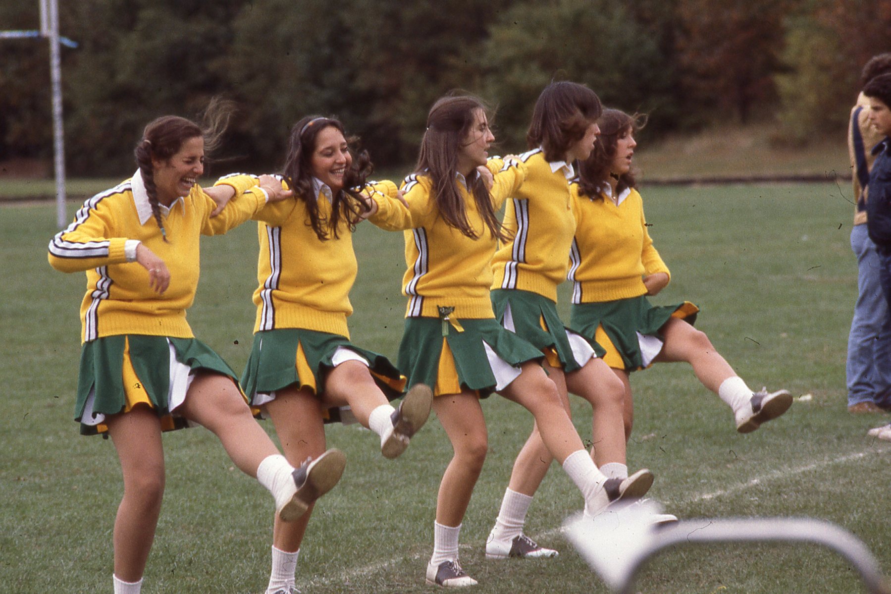 Taylor Montgomery/Gordon Solovey Football Collection. 1978-1981. Picture 59 of 296. Cheerleaders having fun. Jenifer Leaf, Claudia Wernick, Jorie Trafford, Kerry Schmidt, Katie Deardourff. Circa 1979.
