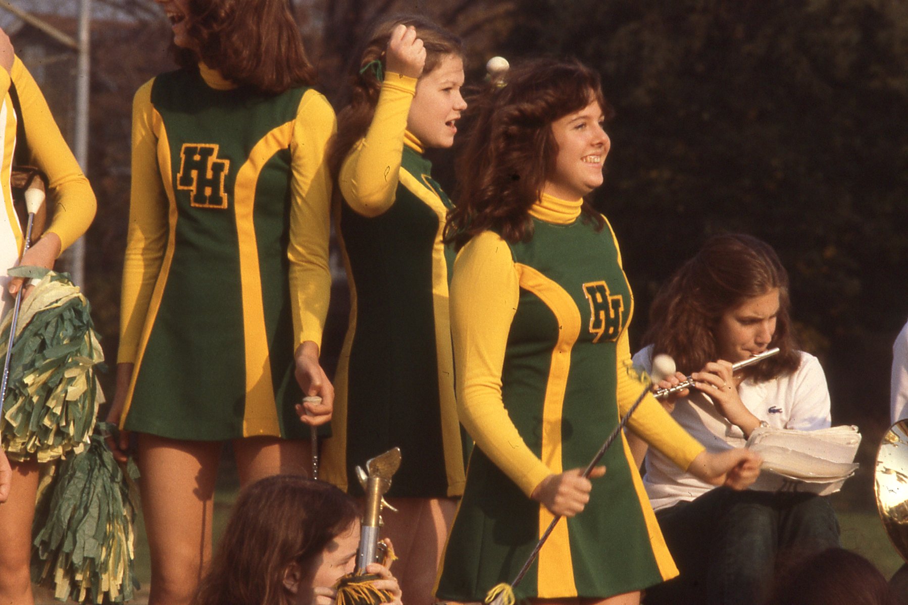 Taylor Montgomery/Gordon Solovey Football Collection. 1978-1981. Picture 80 of 296. Twirlers on the sidelines with the band. The twirler on the right is Silvia Padegs and the flute player is Nadia Sa’ad.