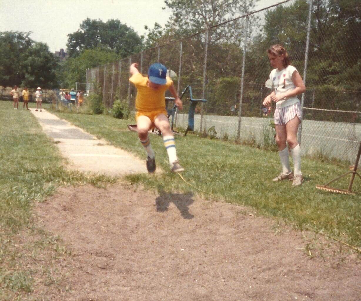 Rich Lovejoy doing the long jump at lower Reynolds on Field Day 1983.