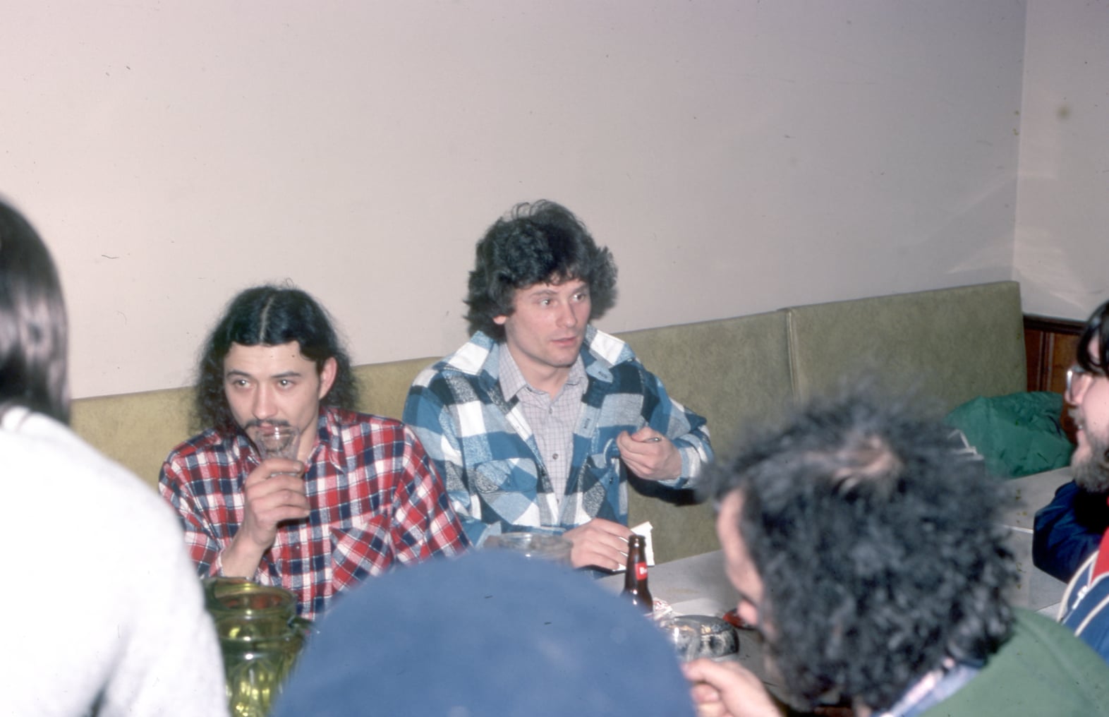 Yedowitz on the left and Andrew Myhal on the right. Backs to the camera facing them are Patsy Cammisa and John Fagan. Circa 1975.
