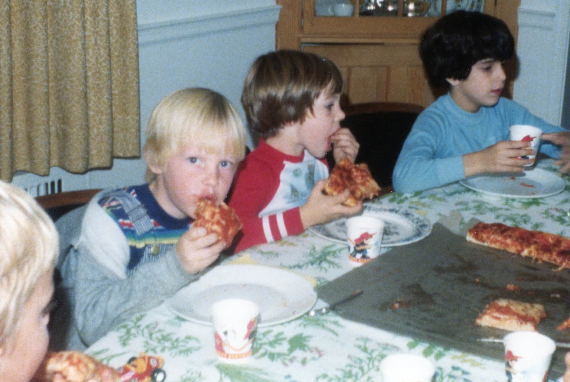 A group of young kids eating pizza at the Drakes in the late 1970’s.